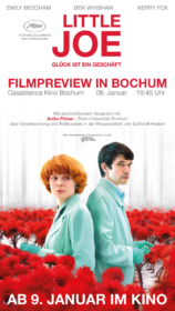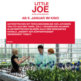 In faszinierend schönen Bildern und mit feiner Ironie erzählt die österreichische Regisseurin Jessica Hausner in der ARTE-Koproduktion „Little Joe – Glück ist ein Geschäft“ die Geschichte der ehrgeizigen Mutter und Wissenschaftlerin Alice, die eine Pflanze erschafft, die Menschen glücklich machen soll. Allerdings scheint sie sich über mögliche Konsequenzen ihrer Schöpfung nicht bewusst zu sein.